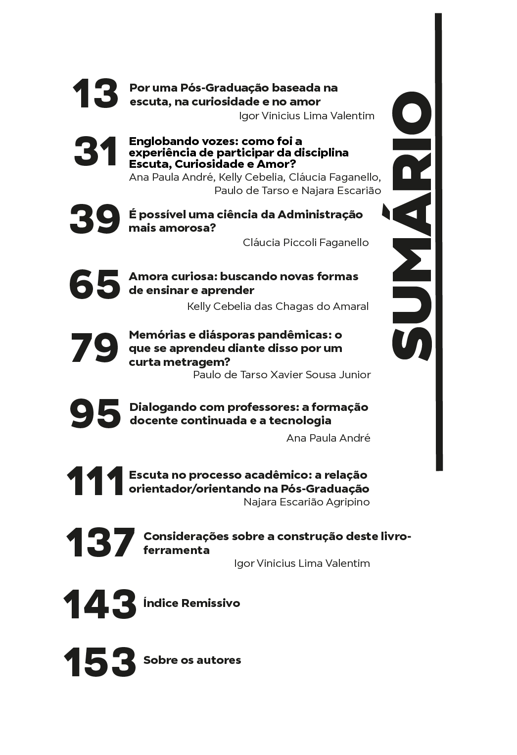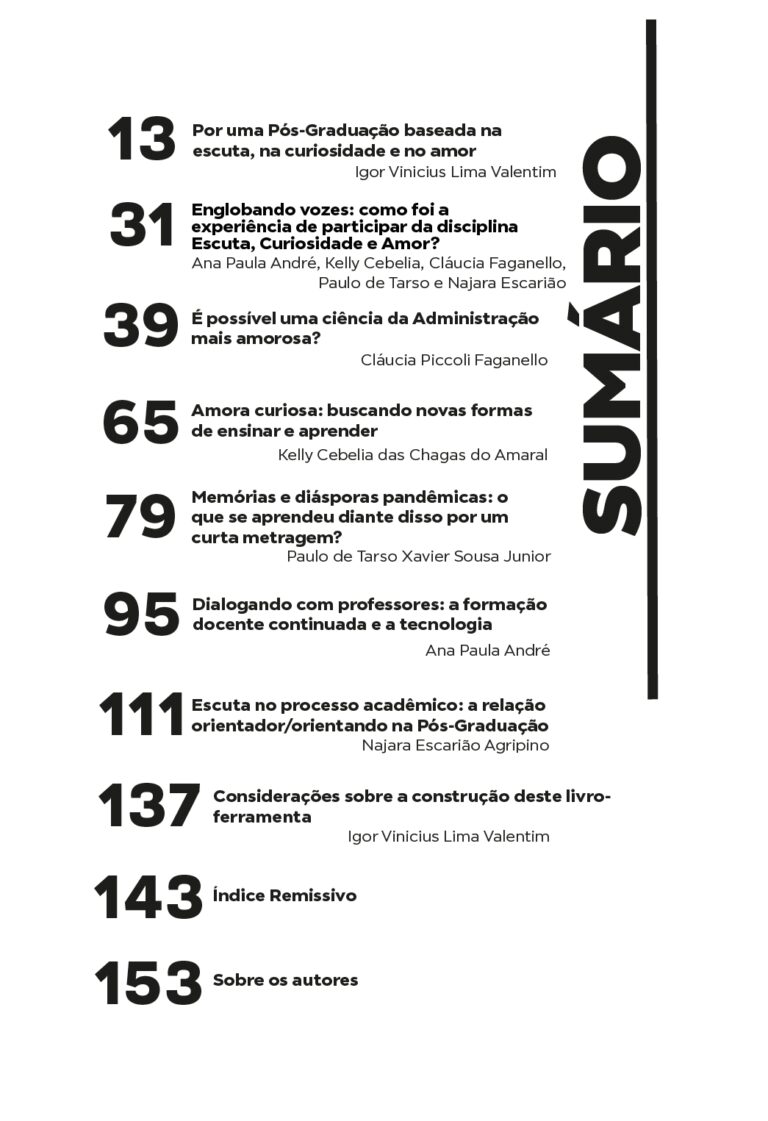 Este livro é fruto de uma aventura coletiva que teve início em uma disciplina de Pós-Graduação chamada Escuta, curiosidade e amor, lecionada a partir da Universidade Federal do Rio de Janeiro, em 2022, aberta a estudantes de todo o Brasil, de maneira totalmente remota e baseada em métodos ativos de aprendizagem.